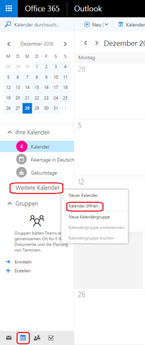 2. Klicken Sie mit der rechten Maustaste auf Weitere Kalender und wählen Kalender öffnen aus.