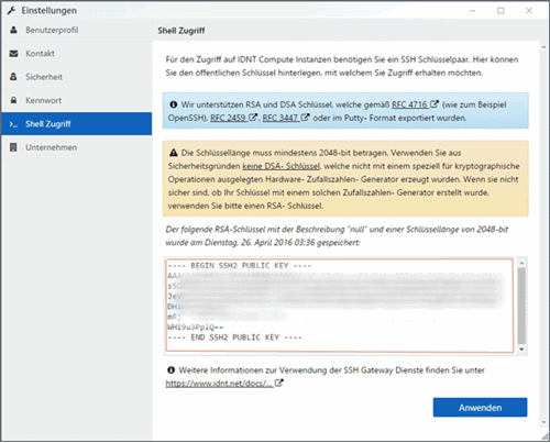 Fügen Sie in den umrandeten Bereich den öffentlichen Schlüssel ein und bestätigen Sie dies über den Button "Anwenden".