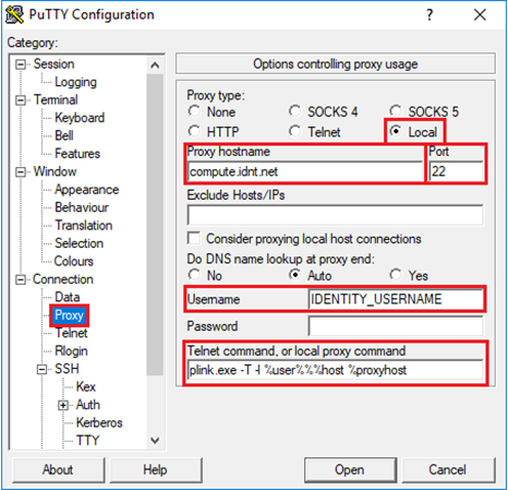 In der Kategorie Connection -> Proxy stellen Sie den Proxy type auf Local und tragen als Proxy hostname compute.idnt.net sowie Port 22 ein. In das Feld Username tragen Sie bitte Ihren IDNT Benutzernamen ein. In das Feld Telnet command geben Sie folgendes ein: