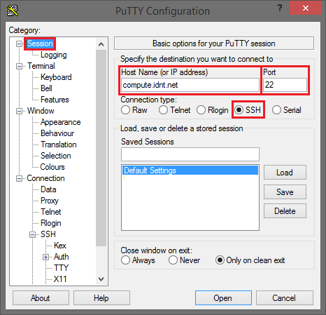 In der Kategorie Session geben Sie als Host Name den Namen der Compute-Instanz ein, auf der Sie sich verbinden möchten, z.B.: ABCDEF-000. Die Angabe für Port lautet 22 und der Connection Type ist SSH.